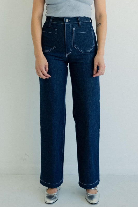 Meet the Ingrid Jean, our Heritage denim favorite that is finally back. Designed with a high waist, slightly wide straight leg, and our signature ranch style front patch pockets, the Ingrid has that classic, slightly sailor vibe that feels timeless and flattering. She hugs you in all the right places through the waist and hips, then falls into an easy, wearable leg that makes your whole outfit feel instantly pulled together.